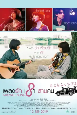 ดูหนัง Farewell Song (2019) เพลงรักเราสามคน เต็มเรื่อง เรื่องราวของ ฮารุ และ เลโอะ ที่ก่อตั้งวงอินดี้ ฮารุเลโอ และมีชื่อเสียง ทั้งสองตัดสินใจไปทัวร์คอนเสิร์ต ทันใดนั้นเขาก็ได้พบกับ ชิมะ ซึ่งเป็นเจ้าบ้าน ที่ขอเป็นผู้ช่วยวงดนตรี นั่นเป็นเหตุผลว่าทำไมเขาถึงชอบเพลงที่ ฮารุ แต่ง ทั้งสามคนไปเที่ยวด้วยกัน เมื่อวงได้รับความนิยมมากขึ้น ความรู้สึกบางอย่างก็ผุดขึ้นมาในใจ และวันหนึ่ง ฮารุ และ เลโอะ ก็ตัดสินใจเลิกกันและแสดงคอนเสิร์ตด้วยกัน ครั้งสุดท้ายที่ ฮาโกดาเตะ ฮอกไกโด และความรู้สึกที่แท้จริงก็ถูกเปิดเผยอย่างช้า ๆ เรื่องราวจะดำเนินไปอย่างไรต่อ ติดตาม ดูหนังออนไลน์ Farewell Song (2019) เพลงรักเราสามคน พากย์ไทย ไม่กระตุก