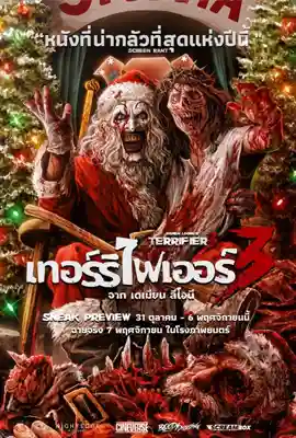 ดูหนังเรื่อง Terrifier 3 (2024) เทอร์ริไฟเออร์ อิหนูกูจะฆ่ามึง 3 ซับไทย จบเรื่อง มีเรื่องย่อว่า หลังจากรอดชีวิตจากการสังหารหมู่ Art the Clown ในวันฮาโลวีน Sienna และพี่ชายของเธอต้องดิ้นรนเพื่อสร้างชีวิตที่แตกสลายของพวกเขาขึ้นมาใหม่ เมื่อเทศกาลวันหยุดใกล้เข้ามา พวกเขาพยายามโอบรับจิตวิญญาณแห่งคริสต์มาสและทิ้งความสยองขวัญในอดีตไว้ข้างหลัง แต่เมื่อพวกเขาคิดว่าปลอดภัยแล้ว Art the Clown ก็กลับมาอีกครั้ง โดยตั้งใจที่จะทำให้ความรื่นเริงในวันหยุดของพวกเขากลายเป็นฝันร้ายครั้งใหม่ เทศกาลแห่งความสุขคลี่คลายอย่างรวดเร็วเมื่อ Art ปลดปล่อยความหวาดกลัวที่บิดเบี้ยวของเขาออกมา พิสูจน์ให้เห็นว่าไม่มีวันหยุดใดที่ปลอดภัย
